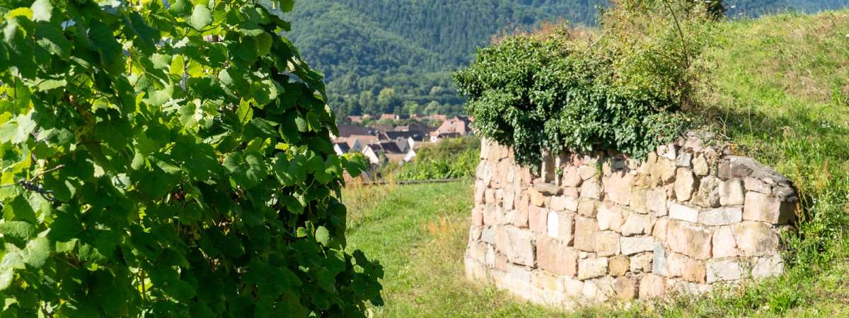 Franchissez la porte fortifiée, puis remontez la Grand’rue. À la sortie du village, continuez sur le chemin des oratoires qui s'enfonce dans le vallon en amont. Après environ 400 mètres, prenez à droite pour pénétrer dans une zone boisée. Le sentier, après un virage à droite, devient plus plat et vous conduit jusqu’à un portail grillagé (veillez à le refermer après votre passage). Ce dernier donne accès aux vignobles, notamment aux coteaux appelés Herrenreben. Le retour vers le village se fait par les chemins empruntés par les vignerons pour accéder à leurs parcelles.