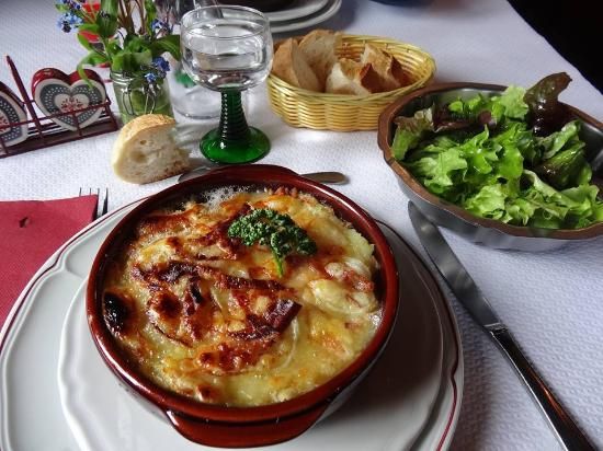 Recette : Cuire les pommes de terre en robe des champs Les éplucher et les couper en cube Dans le fond du plat à gratin (assez haut) mettre l’ail écrasé Puis les cubes de pomme de terre Le fromage coupé en 4 morceaux et bien posé dessus Saupoudrer de cumin, sel, poivre Mouiller avec le verre de vin et la crème Enfourner à 180°C durant 30 min (si les pommes de terre sont encore chaudes)
