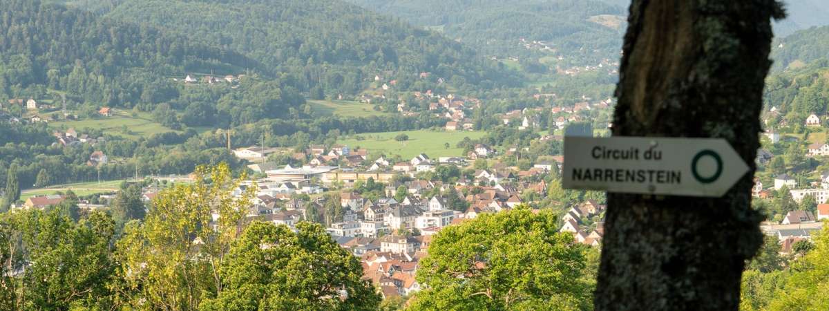 Emprunter le chemin du Narrenstein qui longe le centre de secours et grimper plusieurs lacets jusqu'au lieu-dit Narrenstein, un joli point de vue sur les toits de Munster et la Grande Vallée. Poursuivre la montée pour arriver au Hexenplatz, la place des sorcières, petit plateau et bel endroit pour faire une pause. Continuer sur le chemin qui s'engage en forêt et poursuivre tout droit jusqu'à Haslach. Arrivé aux premières maisons, suivre les balises à gauche puis descendre la route sur 500 m environ jusqu'à un virage en fond de vallon, où l'on quitte la route pour monter à droite dans la forêt. En arrivant sur de grands prés, poursuivre l'itinéraire en balcon qui offre de belles vues. Arrivé près du village de Hohrod, le sentier aboutit sur une petite route goudronnée que l'on suit vers la gauche sur 50 m avant de descendre à droite jusqu'à une deuxième petite route que l'on suit encore vers la gauche pour rejoindre un deuxième chemin en balcon, qui revient vers Munster. Après 1 km et au bout de ce chemin, prendre à droite et descendre par le sentier dit "Fünf Pfennig Weg", pour rejoindre à gauche une petite route que l'on descend sur quelques mètres pour la quitter, avant le pont à gauche, et traverser les prés du Dubach. Après les jardins partagés et l'ancien enclos à cigognes, rejoindre le centre ville et la place du Marché en passant le pont sur la Fecht puis en poursuivant tout droit.