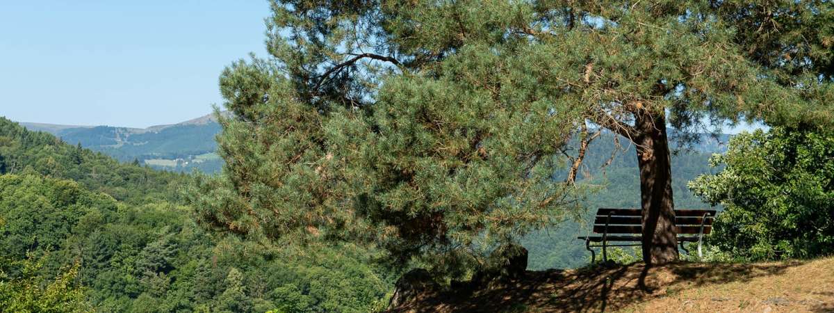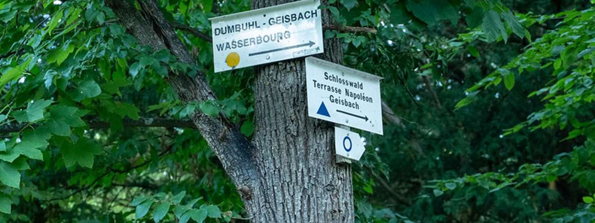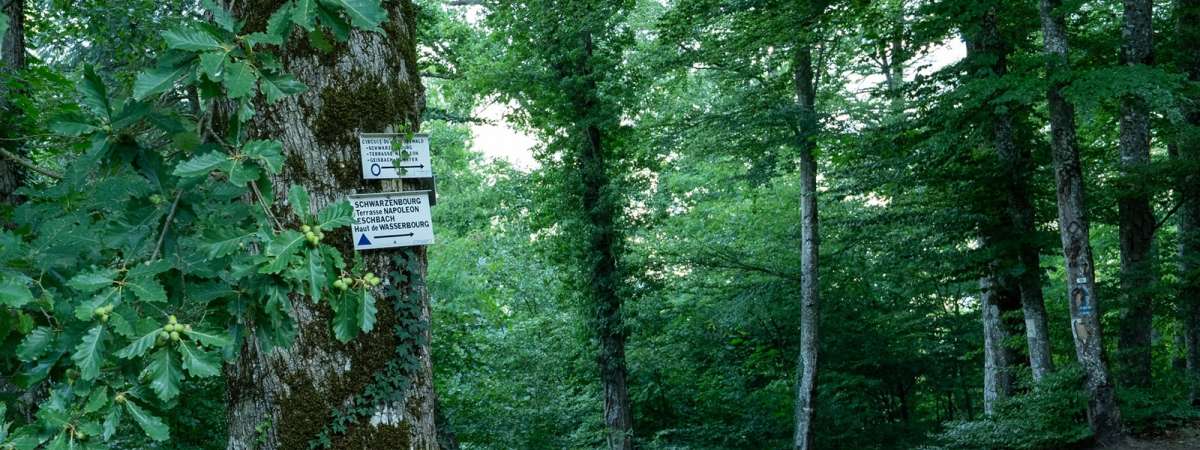 Au carrefour, prendre à droite en suivant la direction « Circuit du Schlosswald – Schwarzenbourg – Terrasse Napoléon ». Poursuivre sur le chemin forestier jusqu’à un virage en épingle, puis continuer en face par un petit sentier montant vers un belvédère équipé d’un banc en pierre. De là, superbe panorama sur les châteaux du Pflixbourg et du Hohlandsbourg ainsi que sur la plaine d’Alsace.