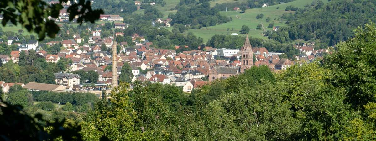 Au carrefour suivant, prendre à droite en direction « Circuit du Schlosswald – Dumbuhl – Munster », puis immédiatement à gauche. Plus loin, un banc domine le Val d’Eschbach. Descendre alors par le chemin, puis dans un virage en épingle à gauche, suivre un petit sentier (attention, glissant par temps de pluie). Celui-ci rejoint la route goudronnée empruntée à l’aller. Retour au parking par le même itinéraire.