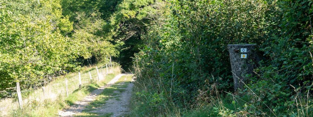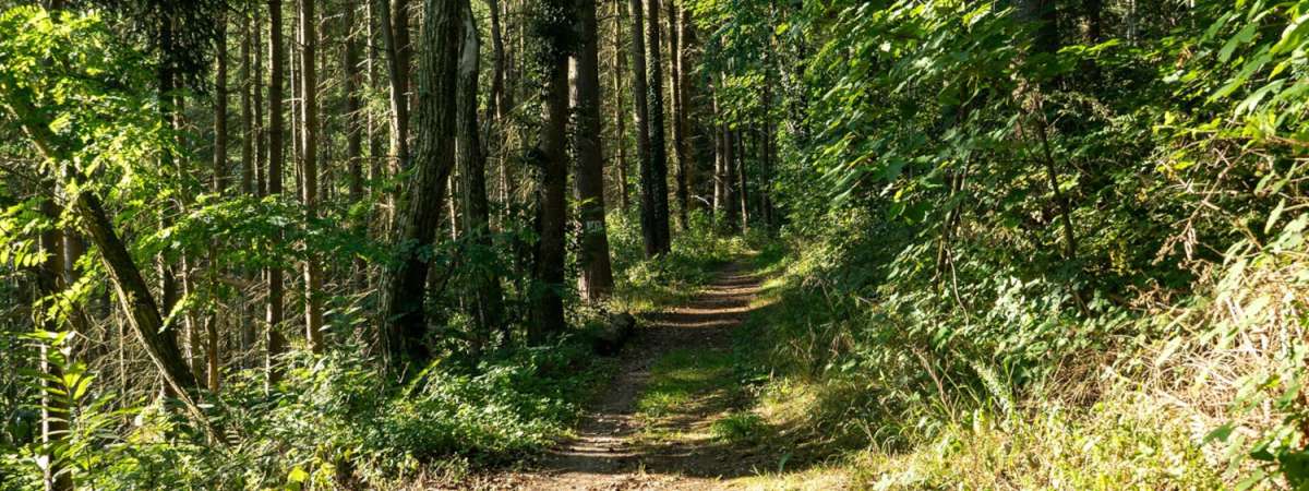 Charmant sentier en sous-bois, bordé de nombreux érables sycomores, qui domine l’entrée de Munster. On passe près d’une grande borne marquant autrefois l’entrée de la propriété des industriels Hartmann.