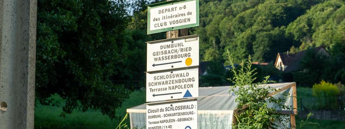Depuis la place du marché à Munster, descendre vers la salle des fêtes, longer le bâtiment et traverser la route en direction du restaurant La Schlitte. Prendre la rue du Pont à droite après le restaurant. Continuer sur la passerelle au dessus de la Fecht. Prendre à gauche le chemain du Fesseneck. Au Stop, traverser la route et prendre le chemain du Dumbuhl qui monte sur la droite.
