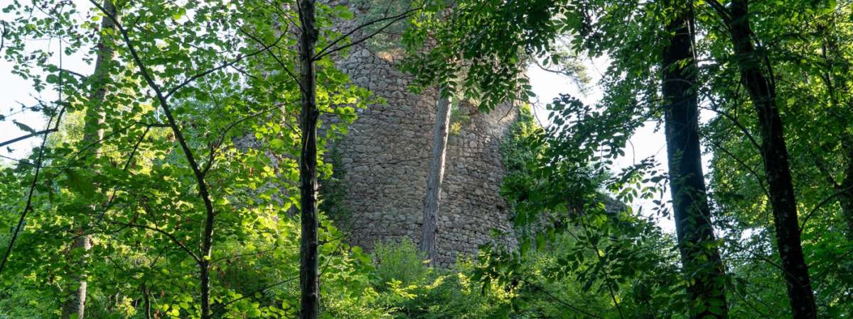Revenir sur le chemin forestier et le suivre jusqu’au virage en épingle menant à la terrasse du château du Schwarzenbourg. L’accès aux ruines est interdit par arrêté municipal (risque d’éboulement). Prendre alors à droite un sentier qui rejoint le chemin forestier. Peu après, un beau point de vue s’ouvre sur le village de Griesbach-au-Val. Sur la droite, on distingue d’anciens blockhaus, vestiges des lignes arrière allemandes de la guerre 14-18.