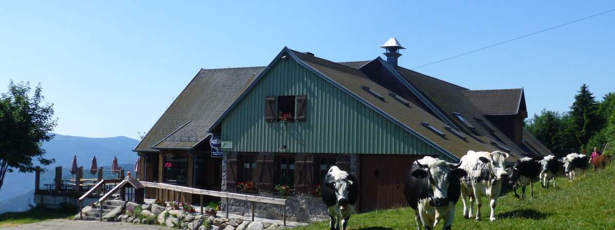 Cette ancienne marcairie a été acquise par les parents de Claude en 1977. Hommes et bêtes y vivent à l’année depuis 1995. Reprise par Mariette et Claude en 2001, l’auberge a bénéficié de plusieurs rénovations dont la dernière en 2015 avec le bois de l’ancienne étable de Munster. Aujourd’hui, leur fille Claire les a rejoints dans l’aventure. La ferme du Gaschney compte 30 hectares de landes et prairies d’altitude, dont 5 ha de prés qui sont fauchés. Il reste encore 15 hectares de prairies de fauche à Munster, l’ancien lieu d’hivernage. Une douzaine de vaches laitières de race vosgienne compose le troupeau, ainsi qu’une dizaine de génisses. Le lait est transformé en fromage de Munster et Bargkass. Quelques veaux sont élevés pour l’auberge. Outre le repas marcaire, les plats à base de rôtis de veau ou de boeuf, et le pot-au-feu, sont servis avec les fameux roïgebrageldis. Le siesskass et les tartes aux fruits de saison sont appréciés au dessert.